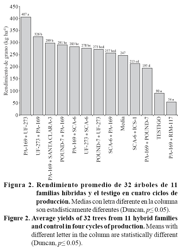 Para la variable índice de semilla, el promedio de los 12 tratamientos arrojó un valor de 0.77. El rango para índice de semilla varió de 0.43 a 0.98. El híbrido PA-169 * UF-273 presentó un peso promedio de semilla seca de 0.98 g, en cuatro ciclos de evaluación; resultados similares fueron observados por Arciniegas y Phillips (2006). El rendimiento promedio de cuatro ciclos expresado en kg ha-1 varió de 54 a 407 kg ha-1 siendo el híbrido PA-169 * Uf-273 quien presentó el valor más alto y superó estadísticamente al testigo (Figura 2). Es importante señalar que los clones UF-273 y PA-169, destacan como progenitores femeninos ya que su hibridación permite alcanzar altos rendimientos de peso fresco, peso seco e índice de semilla.