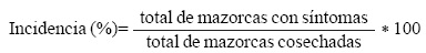 Incidencia de moniliasis. La enfermedad se estimó por la cuantificación del total de mazorcas producidas por híbrido, número de mazorcas sanas y número de mazorcas enfermas. Con base en esto, se determinó el porcentaje de incidencia mediante siguiente fórmula: