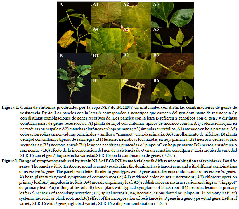 Ambas especies virales producen síntomas similares en las plantas de frijol, que incluyen mosaicos, enanismo, rizado de las hojas, y clorosis. Adicionalmente pueden causar otros síndromes que consisten en necrosis sistémica o vascular y necrosis apical (Kelly, 1997), también conocidas como raíz negra (Saiz et al., 1994), que culminan con la muerte de la planta. Dependiendo de la combinación genética del cultivar infectado, este síndrome puede ser causado por BCMNV, a cualquier temperatura, o por algunos patogrupos de BCMV a temperaturas superiores a los 30 °C como resultado de una respuesta hipersensible (RH) asociada con la presencia del gen de resistencia I, que favorece la diseminación de necrosis vascular (Whitmer-Collmer et al., 2000).