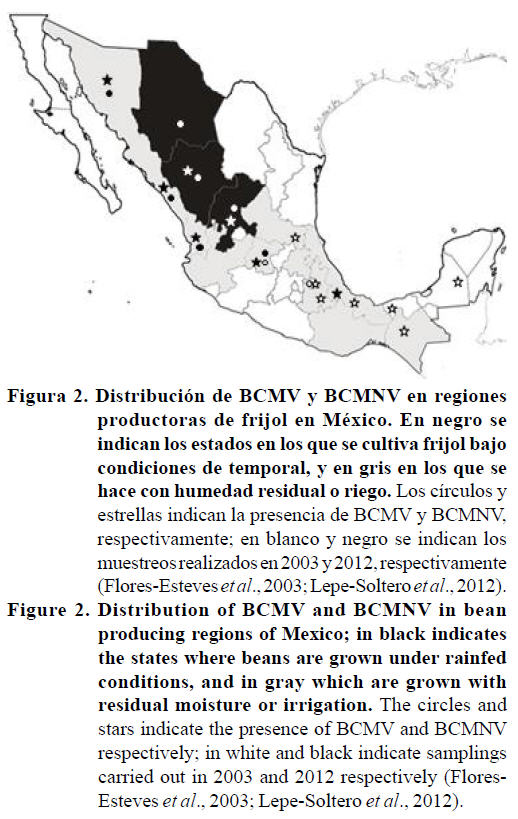 Reportes posteriores sobre la distribución de BCMV y BCMNV, basados también en la sintomatología, indicaron la presencia del primero en los estados de Guanajuato (Montenegro, 1970), Puebla (Díaz-Plaza et al., 1992), Veracruz (López-Salinas et al., 1994) y Sonora (Jiménez-García y Nelson, 1994). Sin embargo, en 2003 con el uso de RT-PCR con iniciadores específicos para cada especie viral, el PMGF del INIFAP en colaboración con el CINVESTAV, Irapuato, detectaron la presencia de BCMV y/o BCMNV en 15 estados productores de frijol (Flores-Esteves et al., 2003). Posteriormente en 2012 se detectaron ambos virus en cuatro de cinco estados evaluados (Lepe-Soltero et al., 2012), y en Guanajuato, donde sólo se había detectado a BCMV, se detectó también a BCMNV (Figura 2) (Flores-Esteves et al., 2003; Lepe-Soltero et al., 2012) debido probablemente a la introducción de semilla infectada que pudo proceder de Nayarit y Sinaloa.