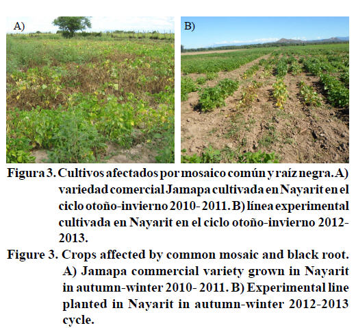 En Nayarit, en condiciones experimentales de riego durante el ciclo 2012- 2013, se registró la muerte de 100% de las plantas, con síntomas típicos de raíz negra, en genotipos mejorados de grano negro opaco portadores del gen I, como Negro Guanajuato, mientras que la variedad Dalia que posee la combinación de los genes I + bc-3 (Acosta et al., 2012), y los genotipos SCR 6, SCR 83, SER 18 y León, que presuntivamente la tienen, no presentaron síntomas (Figura 3).