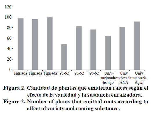 En la Figura 2 se observa la cantidad de plantas que emitieron raíces según el efecto de la variedad y la sustancia enraizadora. La variedad Tigriada emitió más raíces, con todos los productos que se utilizaron los valores fueron altos, superiores a 90, incluso cuando no se inoculó. No obstante, se logró el enraizamiento de 99% de los propágulos cuando estos fueron sumergidos en agua.