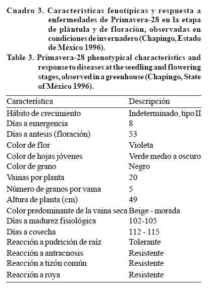 En el Cuadro 3 se presentan las características fenotípicas y la respuesta a enfermedades. Primavera-28 posee emergencia vigorosa y sus primeras flores aparecen a los 53 días. Sus flor es morada. La cubierta vegetal alcanza 60 cm, lo cual es deseable para un desarrollo adecuado de ramas y vainas en variedades con hábito de crecimiento II. Se desarrolla bien en ambientes con precipitación pluvial mínima de 250 a 300 mm y suelos profundos. Es resistente a antracnosis (Colletotrichum lindemuthianum (Sacc. And Magn.) Scribner, a tizón común (Xanthomonas campestris pv phaseoli (Smith) Dye) y a pudriciones de raíz; es tolerante a roya (Uromyces phaseoli). Tiene de 102 a 105 días a madurez fisiológica y sus vainas son chicas (10 cm de longitud) con cinco a seis semillas, estas últimas con forma prismática, color negro opaco, tamaño chico.