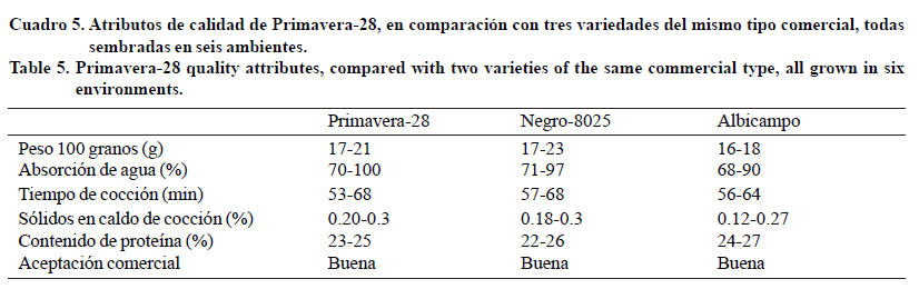 Primavera-28 ofrece buena calidad comercial por las características de su grano negro opaco tipo Jamapa; además de su suavidad a la cocción (< 80 min) y alto contenido de proteína (23-26%). En el Cuadro 5 se presentan los datos de calidad de Primavera-28.