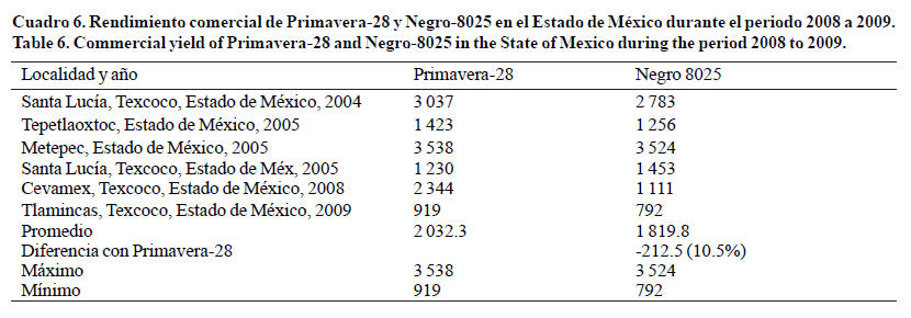 Esta nueva variedad se comparó a nivel experimental y comercial con Negro 8025, el cual se utilizó como testigo, por su buen potencial de rendimiento y cuyo grano es de la misma clase comercial. El rendimiento de Primavera-28 fue 10.5% superior al de Negro-8025. En el Cuadro 6 se presentan los rendimientos obtenidos en diferentes años y localidades de prueba.