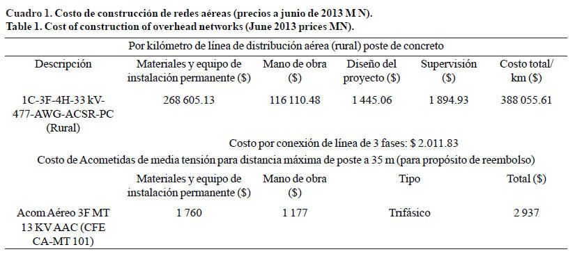 Para determinar los costos de instalación así como las tarifas de energía eléctrica elegimos de acuerdo con las normas de distribución - construcción - instalaciones de CFE para redes aéreas de media y baja tensión el sistema de distribución de tipo A; es decir, 3 fases-4 hilos (3 F-4 H) con una tensión nominal entre fases de los circuitos de media tensión de los sistemas de distribución de 13, 23 y 33 Kv (CFE, 2006).