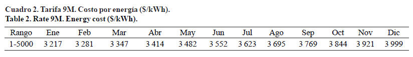 Tarifas agrícolas. De 4 diferentes tarifas (9, 9M, 9CU y 9N) la tarifa 9 corresponde al costo del servicio para bombeo de agua para riego agrícola en baja tensión y los costos son iguales a la 9M (en los primeros 5000 kWh por mes) que sirve exclusivamente a servicio para bombeo agrícola en media tensión así como al alumbrado del local donde se encuentre instalado el equipo de bombeo. En el Cuadro 2 se presenta esta tarifa durante el año 2013 y se observa que existe un incremento mensual.