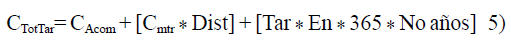 Es importante resaltar que para realizar una comparación entre costos de instalación de SFV y extensión de líneas de CFE se debe incluir el pago de tarifas de energía suministrada para agricultores durante diferentes años. El costo total incluyendo la tarifa (CTotTar) se calcula de acuerdo con la ecuación (5):