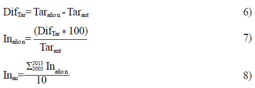 Dónde: DifTar= diferencia de tarifa [$], Taraño n= tarifa de 1 kWh al año n [$ kWh], Tarant= tarifa anterior al año n de 1kWh [$ kWh], Inaño n= incremento en un año n [%], Inan= promedio de incremento anual de la tarifa de los años 2013-2023 [%].