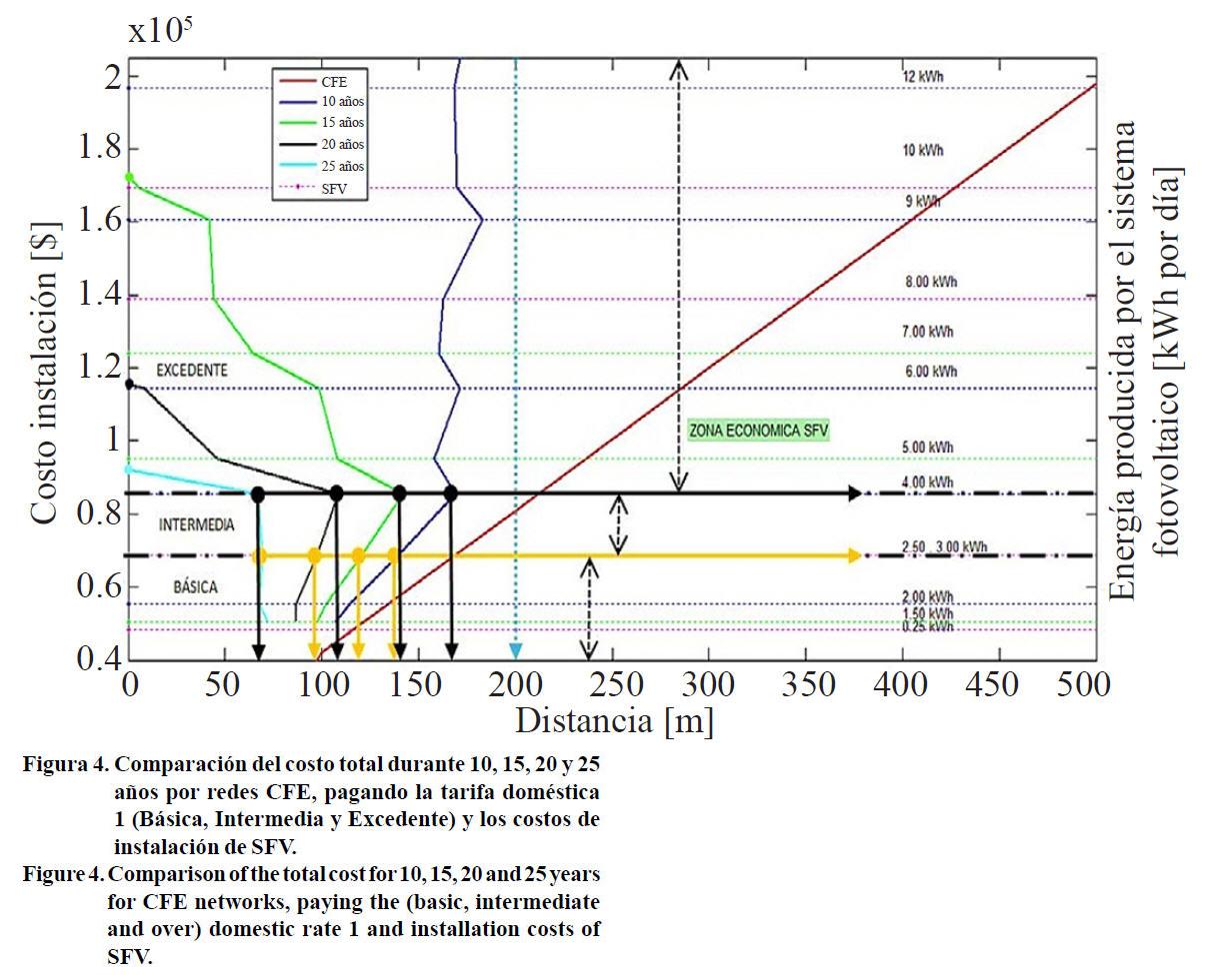 Para las tarifas domésticas básica e intermedia resulta que la distancia mínima de justificación de instalación de SFV va entre los 170 y 70 metros para los 10, 15, 20 y 25 años. Por otra parte, para la tarifa doméstica excedente para 10 años la distancia de justificación es de 200 metros y para 15, 20 y 25 años de uso de SFV es económicamente viable para la energía consumida mayor de 10.2, 6 y 4.8 kWh por día correspondientemente instalar SFV en lugares donde ya existe la red eléctrica de CFE ya que para energías mayores los gastos por consumo energético durante estos años rebasan los costos de instalación de SFV.