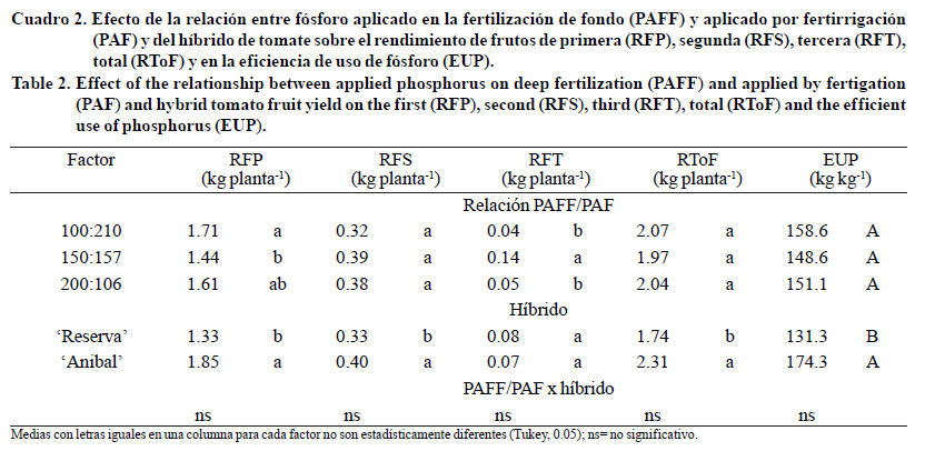 Al comparar la EUF de los genotipos, 'Anibal' registró 174 kg kg-1, 33% mayor a la obtenida con 'Reserva'. Considérese que estos resultados son parciales a la cosecha del tercer racimo. Al respecto, Ojodeagua et al. (2008) reportan EUF de 1 000 kg kg-1 para un cultivar de tomate tipo bola con 18 racimos cosechados por planta. Para mejorar la EUF por los cultivos deben integrarse tres estrategias que incluyen: el mejoramiento genético (convencional o asistido molecularmente), la ingeniería genética (transgénicos) y la fertilización con P y utilización de microorganismos que favorezcan la biodisponibilidad del P, todas ellas asociadas con buenas prácticas de manejo del cultivo (Ramaekers et al., 2010).