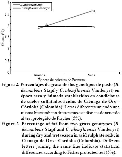 Analizando los porcentajes de grasa encontrados en B. decumbens en la época seca, se observa que son mayores que los reportados para diferentes especies del género Brachiaria en suelos ácidos de Santander (Colombia), donde se publican valores encontrados entre 1.6 y 1.9% (Canchila et al, 2009). Asimismo, de manera similar a lo observado en el presente estudio para pasto Estrella, investigadores, reportan que en Costa Rica los contenidos de grasa pasaron de 2.3% en la época semiseca a 1.9% en la época lluviosa; aunque estos datos son superiores a los de este estudio, la tendencia es similar y las diferencias pueden obedecer al diferencial grado de severidad de estrés por sequía presentado en cada situación (Sánchez y Soto, 1996).