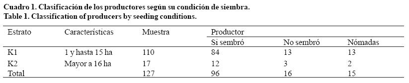 Durante el ciclo otoño-invierno 2012 se identificó que 76.80% de los productores entrevistados sembraron sandía y 23.20% no sembraron, esto principalmente por el precio poco atractivo de fruta y, falta de capital para invertir, entre otros factores. Del primer estrato o grupo de productores se encontró que 76.36% sembró sandia durante ese ciclo, 11.81% no sembraron y 11.81% se consideraron productores nómadas según la tipificación propuesta por Canales (2003), pues si bien estaban registrados dentro del padrón, estos arrendaron tierras para la siembra por un ciclo o emigraron a otras regiones para establecer el cultivo, por lo que no se les pudo localizar de manera personal (Cuadro 1).