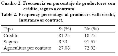 A pesar de ser experimentados por el número de años que se han dedicado a esta actividad, cuentan con bajo nivel académico, ya que en promedio solo tienen hasta cuatro años de escolaridad. El grueso de esta población de productores se ubica en edad productiva de 35 a 39 años (15.63%), 40 a 44 años (14.58%) y 45 a 49 años (18.75%) con 100% de eficiencia laboral (Chalita, 1968). El 81.25% de los productores realiza compras a crédito de los insumos agrícolas que utilizará durante el ciclo productivo, lo que implica la falta de solvencia económica al inicio de la actividad, que también se ve reflejado en la poca participación de los productores para la compra de seguros agrícolas, ya que solo el 8.33% aseguró su producción.