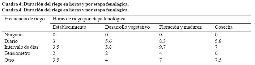 En el Cuadro 4 se observa que los productores que riegan por intervalos aplican prácticamente la misma cantidad de horas de riego que los que riegan diario por consiguiente la planta alcanza niveles de déficit hídrico siendo esta la razón principal de la diferencia de rendimiento.