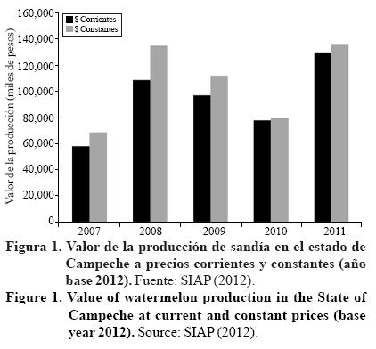 En el período 2007 a 2012 se registraron incrementos en la el valor de la producción de sandía de riego en el estado. Las variaciones del valor de la producción a precios corrientes a lo largo de estos cinco años se debieron a las fluctuaciones en el precio o a las variaciones en la cantidad producida, que durante 2008 y 2011 registraron cantidades de 48 227 y 48 743 t y valores de $108 445 506.00 y $129 206 543.00 respectivamente. La misma tendencia se puede apreciar en el valor de la producción a precios constantes registrando valores de $134 626 291.00 en 2009 y $136 066 711.00 en 2011 (Figura 1).
