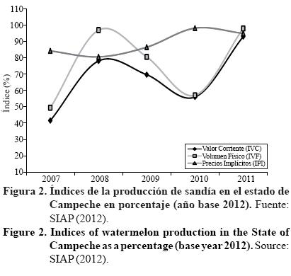 Para conocer la evolución de la producción de sandía a nivel estatal y contar con una visión de corto y mediano plazo, se calcularon indicadores como: valor de la producción a precios corrientes y constantes así como índices del valor corriente de la producción, volumen físico y precios implícitos (SIAP, 2003). Para ello fue necesario una serie histórica del volumen de la producción y precios medios rurales del año agrícola del 2007-2012 (SIAP, 2012) y precios por kilogramo del 2007-2013 (SIIM, 2013).