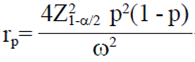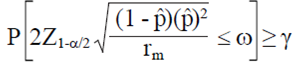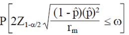 Debido a que la Ec. 3 utiliza una estimación de p, la anchura del IC (W) es una variable aleatoria que fluctuará de muestra a muestra. Esto implica que usando rp de la Ec. 5, alrededor del 50% de la distribución de muestreo de W será menor que ω (Tercer columna del Cuadro 1). Para demostrar esto, se debe calcular la probabilidad de obtener una amplitud del IC menor al valor especificado ω). Esto se puede calcular por medio de: