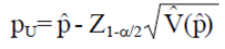 Donde: Z1-α/2 es el cuantil 1-α/2 de la distribución normal estándar, y p es el EMV. Esta aproximación del IC es fácil de calcular y permite derivar fórmulas del tamaño de la muestra de forma cerrada. Sin embargo, cuando r es pequeña, la aproximación normal para EMV es dudosa; puesto que en tales casos, el IC de Wald frecuentemente produce puntos finales negativos. Además, la probabilidad de cobertura de los IC's construidos por el IC de Wald es frecuentemente menor que 100 (1 - α)%.