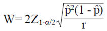 ) en la Ec. 2 se define como W/2 (donde W es la amplitud del IC; W o W/2 se puede establecer a priori por el investigador dependiendo de la precisión deseada). La amplitud del IC observado para cualquier realización de este intervalo de confianza (A partir de la Ec. 2) se puede expresar como: