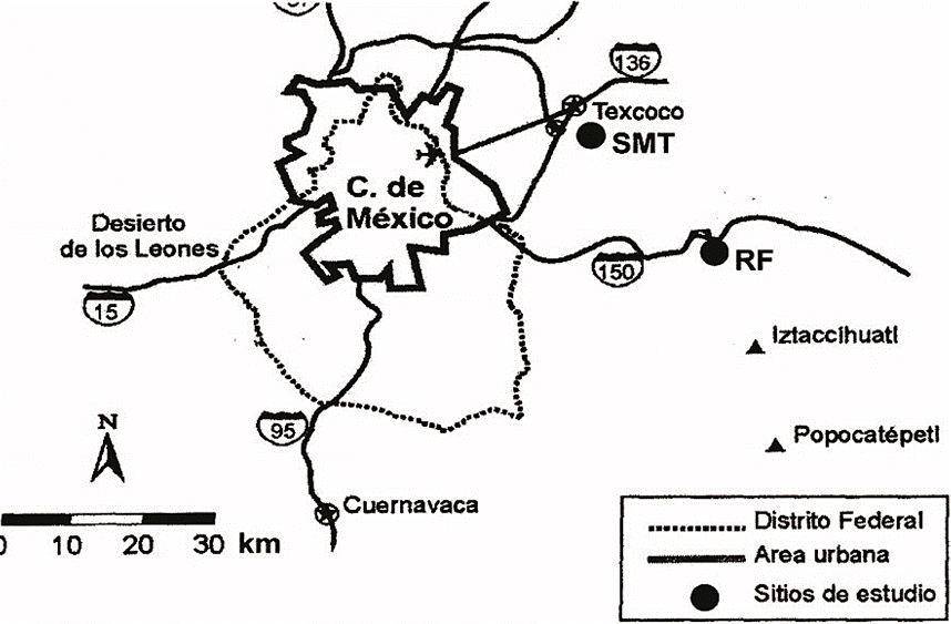 Se seleccionaron dos bosques de oyamel del estado de México, el primero, en San Miguel Tlaixpan (SMT), donde se presentan rodales con diferente grado de daño de copa, y el segundo localizado en Río Frío (RF), un sitio testigo donde no se observaban síntomas de daño de copa (Figura 1).
