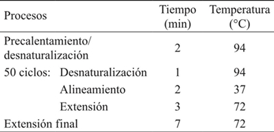 Se utilizaron equipos con reactivos preparados de amplificación de ADN (GoTaq® Green Master Mix, PROMEGA) mediante PCR, siguiendo las indicaciones del fabricante. Después de varias pruebas para definir las condiciones óptimas de concentraciones de ADN, concentraciones de los cebadores y temperaturas de alineamiento, se definieron los parámetros para la mezcla de reacción de PCR (Cuadro 2) y para el programa del termociclador Techne TC-512 Thermal Cycler (Bibby Scientific Ltd., UK) (Cuadro 3). Se probaron un total de 22 cebadores decámeros aleatorios diseñados por Operon Technologies y producidos por IDT (Integrated DNA Technologies, USA) (Cuadro 4). Los productos de amplificación se corrieron rutinariamente en gel de 2.5% de agarosa con buffer TBE 1x durante 2:45 h aplicando 65V. El peso molecular aproximado se referenció mediante marcadores de peso molecular (50 bp, invitrogen).