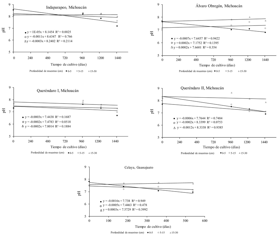 El pH en los Vertisoles evaluados fue de alcalino a fuertemente alcalino antes de la implementación de las prácticas de agricultura de conservación (PAC) (Figura 2). El pH disminuyó en función del tiempo de cultivo, hasta cerca de una unidad en el estrato de 0-5 cm de profundidad. En los estratos de 5-15 y 15-30 cm la disminución del pH fue más tenue. En el primer estrato del suelo la actividad biológica fue más intensa, por estar en contacto directo con la capa orgánica de los residuos de cosecha. Según Galeana-Cruz et al. (1998) la adición de materia orgánica (MOS) en la superficie del suelo, como parte de las PAC, es el componente con mayor influencia en el abatimiento del pH. La mineralización de la MOS implica necesariamente una actividad más intensa de los microorganismos del suelo, y durante el proceso de humificación se producen ácidos orgánicos que reaccionan con la fracción mineral del suelo.