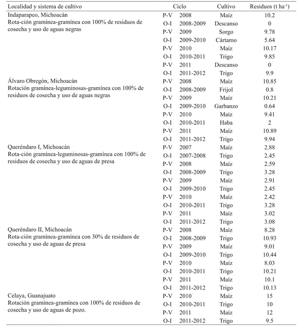 Los suelos localizados en Indaparapeo y Álvaro Obregón, son regados continuamente con aguas negras provenientes de la ciudad de Morelia, mientras que los suelos de Queréndaro se riegan con agua de la presa. En todos los suelos se adicionó el total de los residuos de cosecha en la superficie, excepto en el suelo denominado Queréndaro II, donde aproximadamente tres cuartas partes se empacan para su venta. La cantidad de residuos de cosecha que se adicionaron en este suelo, después de cada ciclo de cultivo, fue variable (Cuadro 2).