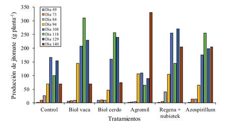 Se estuvo cosechando y pesando el fruto conforme alcanzó la madurez, los tratamientos donde se aplicaron los bioles fueron los primeros donde se empezó a cuantificar frutos maduros, lo cual es un indicio de la presencia de sustancias que estimulan la maduración del fruto, la producción más alta con ambos bioles se registró entre los 108 y 129 con máximo a los 118 días. Con Azospirillum hubo producciones altas entre los 108 y los 140 días, con máximo a los 118. En el tratamiento con Regena y Nubiotek la máxima producción se alcanzó entre los 108 y los 140 días, con máximo a los 129 días. Con la adición del Agromil el máximo se alcanzó a los 140 días. En todos los casos se obtuvo mayor producto comparado con el control. La Figura 3 muestra la producción específica de jitomate.
