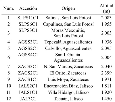 The samples used belong to the genebank of the Colegio de Postgraduados, San Luis Potosí Campus, México (Table 1). During the 2013 year, seeds of twelve castorbean accessions were completely random collected in the states of San Luis Potosí, Aguascalientes, Zacatecas and Jalisco, México; the castorbean plants were in zones between 1 400 and 2 400 masl. The twelve accessions were collected following transects in the different regions of influence, from plants without presence of pests and diseases, vigorous, with seed supply and agronomic production characteristics. Geo positioning data, characteristics of the plant and agri-environmental aspects as well as the description and identification of the collected materials were recorded (Isaza et al., 2017).