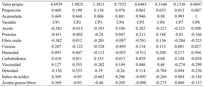 The main component 1 (CP1), allows to explain the 46.9% of the global variance; with a value of 4.69, this main component shows a greater association with the following four variables: carbohydrates (41.8%), protein (41.1%), lipids (38.2%) and crude fiber (38.2%), which have a high participation in the definition of CP1, so it can be interpreted that high values present in this main component tend to have high average values in these four nutrients mentioned above. The main component 2 (CP2), participates with its own value (1.98) and 19.8% of the explained variance, in which the variable humidity is found (60.7%), viscosity (55.5%) and density (55.3%), two variables that refer to the oil quality and one to the seed. In the main component (CP3), there is an acidity index (46.2%) and free fatty acids (46%), this component consists only of attributes of oil quality. Finally the last one in the CP4 is ashes which is not associated with any other variable, considering this component allows to add 7.6% of the variation of the explained process.