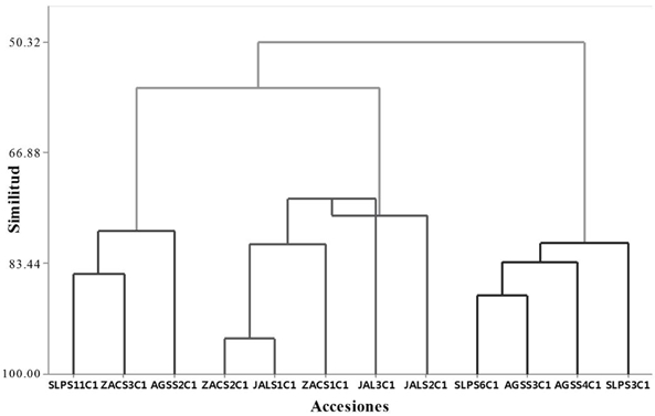 According to the cluster analysis (Figure 2), the twelve accessions were classified into relatively homogeneous groups, using a similarity of 66.6%, by means of the Euclidean distance as a grouping method. Three predominant clusters were identified for the twelve accessions. The first one consists of: SLPS11C1, ZACS3C1 and AGSS2C1, the second consisting of: ZACS2C1, JALS1C1, ZACS1C1, JAL3C1 and JALS2C1; and the third by: SLPS6C1, AGSS3C1, AGSS4C1 and SLPS3C1.