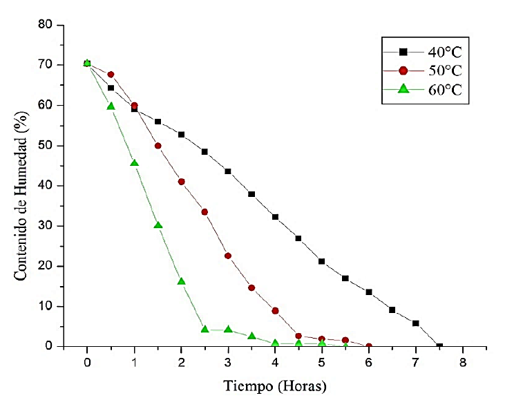 La Moringa oleifera presentó una humedad inicial de 70.3%. En el Cuadro 2 se presenta el tiempo de secado y la humedad libre para las temperaturas de estudio. Estos resultados coinciden con la relación entre temperaturas elevadas y menores tiempos de secado.