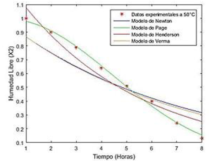 Para el modelado de la cinética de la Moringa oleifera se ajustaron modelos matemáticos a los datos experimentales, siendo los de Newton, Page, Henderson y Verma (Cuadro 1) los seleccionados ya que son los que más caracterizan la cinética de secado de plantas nutrimentales y medicinales (Corrêa et al., 2007).
