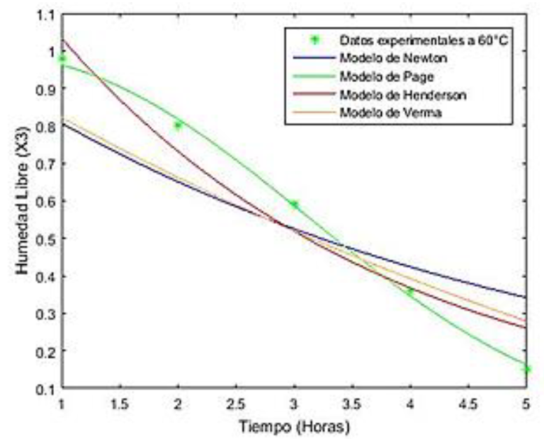 Mediante la regresión lineal, se obtienen los valores de los parámetros asociados con la mejor curva de ajuste, para los datos experimentales de humedad libre