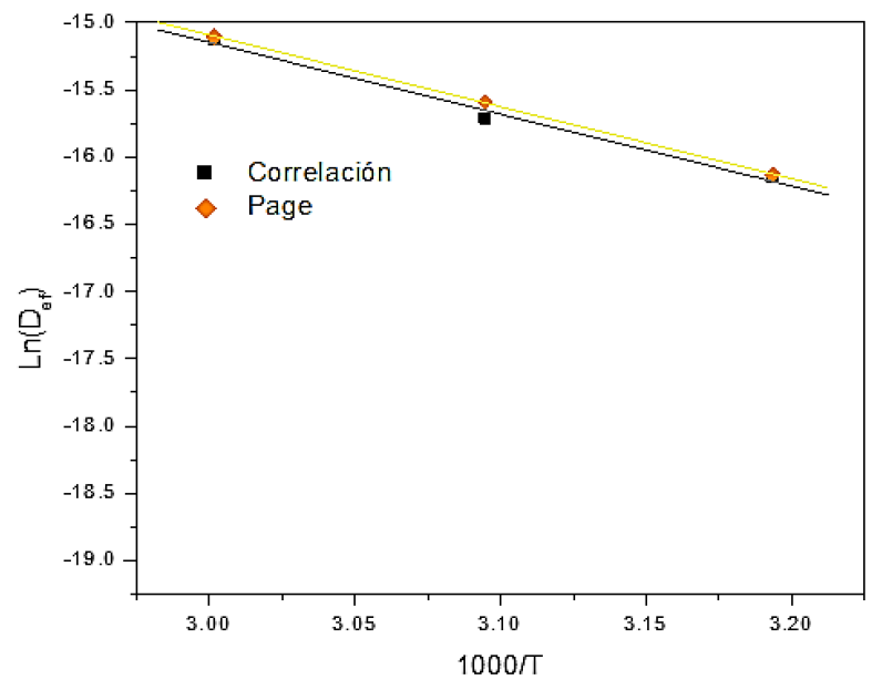 El coeficiente de difusión (Def)es una difusividad efectiva cuyo valor es calculado a través del modelo matemático ajustando los valores experimentales. Puede entenderse como la facilidad con que el agua es removida del material, esta varia conforme cambia las condiciones de secado (temperatura y velocidad del aire), no es intrínseca al material (Giraldo y Arévalo, 2010). Los valores del coeficiente de difusión se obtuvieron a través de la correlación logarítmica de los datos experimentales (