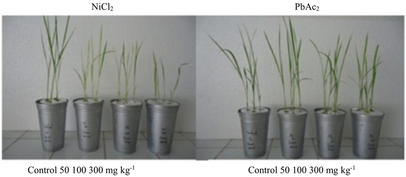 El desarrollo de las plantas se afectó por ambos metales (Ni y Pb) (Figura 1). En comparación con el control, las plantas que crecieron en presencia de NiCl2 no desarrollaron completamente sus hojas y la altura de la planta se redujo en todas las concentraciones analizadas, especialmente las tratadas con 300 mg kg-1. Lo mismo ocurrió con las plantas a las que se aplicó PbAc2 en las concentraciones de 100 y 300 mg kg-1.