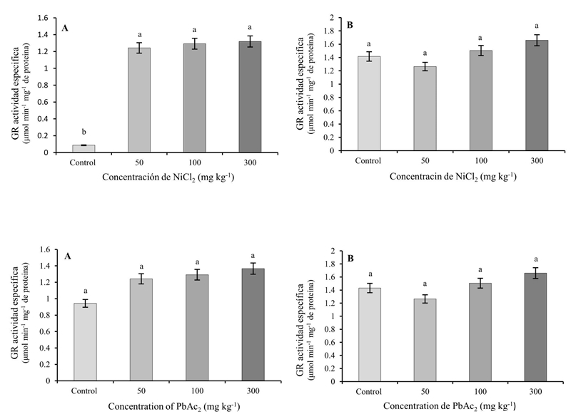 La enzima superóxido dismutasa (SOD) mostró diferentes comportamientos en hojas y raíces para los tratamientos con los dos metales pesados, en cambio sólo el NiCl2 provocó incrementos significativos en la actividad de la glutatación reductasa (GR) en las raíces en todas las concentraciones con respecto al control. El PbAc2 no causó diferencias en la actividad de GR con respecto al control en ninguno de los órganos analizados.