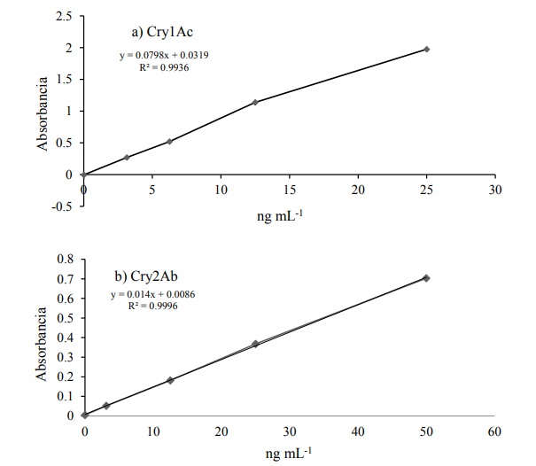 Cuadro 2 Concentraciones y mediciones de absorbancia para las proteínas Cry1Ac y Cry2Ab.