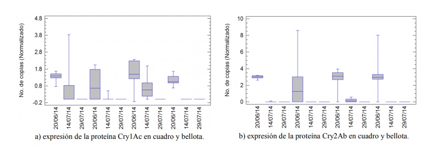 Una vez sintetizado el ADN complementario, se procedió a la cuantificación de los genes codificantes para las proteínas Cry1Ac y Cry2Ab expresados en los tejidos ya mencionados anteriormente. Debido a la dispersión obtenida de los datos, se procedió a realizar la prueba de Kruskal-Wallis analizando la mediana de los datos para concluir si existió o no diferencia estadísticamente significativa. Dichos resultados evidenciaron que no existe una diferencia significativa, con respecto al tiempo, en la expresión de la proteína Cry1Ac (p= 0.84) y Cry2Ab (p= 0.446) en hojas; si existe diferencia en cuadros y bellotas para ambas proteínas (p= 0.0004 para Cry1Ac, p= 0.001 para Cry2Ab).