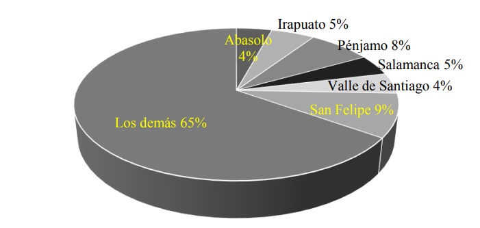 Como se mencionó, Guanajuato contribuye con 6% del total nacional, donde la superficie se distribuye de manera similar en todos los municipios, siendo San Felipe, Pénjamo, Salamanca e Irapuato, Abasolo y Valle de Santiago que participan con 9, 8, 5 y 4% respectivamente, mientras que 65% comprende los demás municipios del estado (Figura 2).