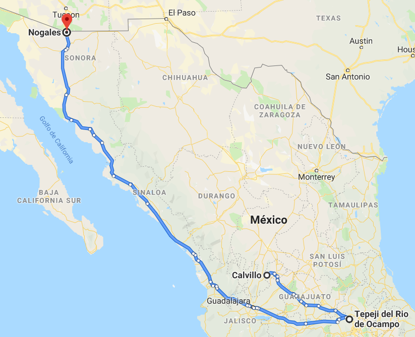 Figura 3 Ruta logística de distribución con frontera en Nogales, Sonora. Elaborado con datos obtenidos de costos de transporte (SCT, 2013).