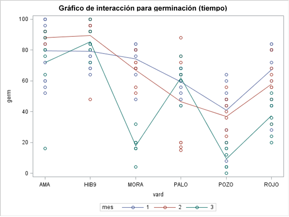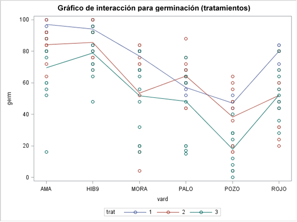 Figura 2 Ilustración de la interacción variedad x tratamiento de osmoacondicionamiento en la variable germinación. Germ= % de germinación; var= variedad; AMA= amarillo; HIB9, híbrido; MORA= Elotes Occidentales Morado; PALO= maíz palomero; POZO= maíz Pozolero blanco; ROJO= Elotes Occidentales Rojo; trat= tratamiento 1 (0 h), 2 (6 h) y 3 (12 h).