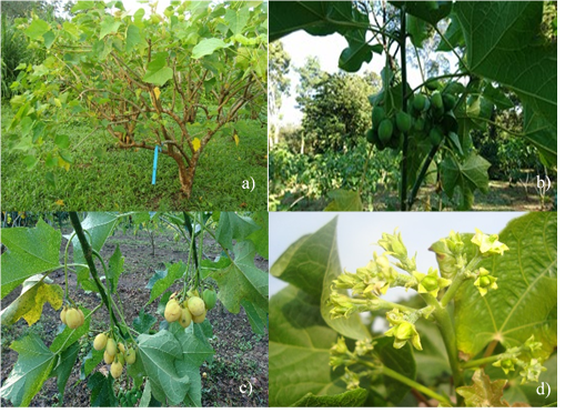 Figura 2 Cultivar clonal ‘Doña Aurelia’: a) arquitectura de la planta; b) y c) frutos verdes y maduros; y d) flores 100 % femeninas.