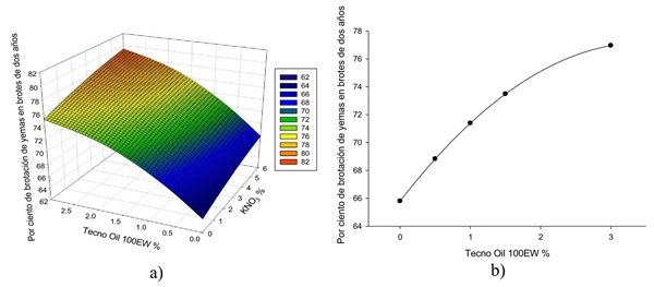 Figura 3 Influencia de las curvas de respuesta que muestran las interacciones para la variable de brotación de yemas de dos años; a) interacción de Tecno Oil 100 EW y KNO3; y b) respuesta cuadrática del Tecno Oil 100 EW en brotación de yemas de dos años.