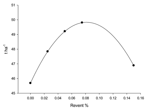 En relación a los resultados obtenidos en producción, en la Figura 4 se muestra la respuesta de tipo cuadrática en donde se logra un óptimo con el rango explorado para Revent con la producción más alta (49.5 t ha-1) al utilizar 800 mililitros por 1 000 L agua, punto donde se registró una inflexión a partir de la cual disminuyó el rendimiento; cabe mencionar, que cuando la dosis sobrepasó el punto de inflexión se observó una tipo de roseteado de las hojas sin que estas logren extenderse completamente, así mismo, los pétalos de las flores no abrieron completamente (precisamente apariencia de flores de rosa) y en cosecha el fruto presentó una apertura más grande que lo normal en la zona del cáliz con una apariencia atípica para esta variedad.