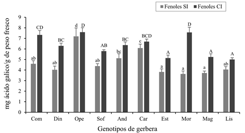 Figura 2 Contenido de compuestos fenólicos (cf) en hojas maduras de diez genotipos de Gerbera hybrida sin incidencia (SI) en etapa vegetativa y con incidencia (CI) de T. vaporariorum en inicio de emisión de capitulo floral y floración. Barras de error corresponde al error estándar. Letras minúsculas=comparación de medias SI; letras mayúsculas=comparación de medias CI. Valores con la misma letra son estadísticamente iguales de acuerdo con la prueba Duncan (p≤ 0.05).