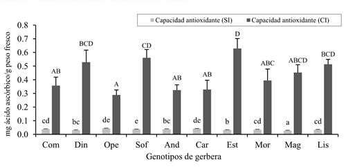 Se encontraron diferencias altamente significativas (p≤ 0.01), entre los diez genotipos de gerbera evaluados tanto en SI como en CI (Figura 4). En SI aun cuando hubo variación entre los genotipos de casi 2:1, sus valores fueron inferiores a los 0.l mg de ácido ascórbico por gramo de peso fresco en todos los genotipos evaluados. Contrariamente, en CI el incremento proporcional en cada genotipo varió de seis a 20 veces con respecto a SI. Lis que destacó con valores intermedios de capacidad antioxidante, mostró bajos valores de contenido de Cf y de AePOX, lo cual posiblemente explique el mayor valor de incidencia de T vaporariorum, caso contrario Com que presentó valores bajos de capacidad antioxidante y valores altos en contenido de Cf y AePOX, además de los menores valores de incidencia del insecto.