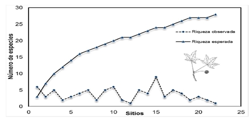 Se encontraron 20 especies por lo que, hasta ahora con el esfuerzo de muestreo realizado, se conoce 19% de las especies teóricamente presentes en los sitios considerados (Figura 2).