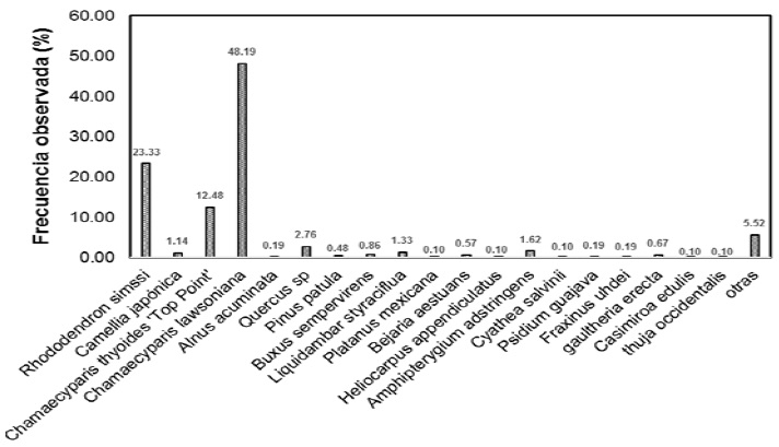 Se registraron un total de 1050 individuos, las especies representativas son Chamaecyparis lawsoniana con 48.19% (506 individuos), Rhododendron simssi con 23.33% (245) y Chamaecyparis thyoides con 12.48% (131), algunas nativas se encuentran abajo de 3% (Figura 1).